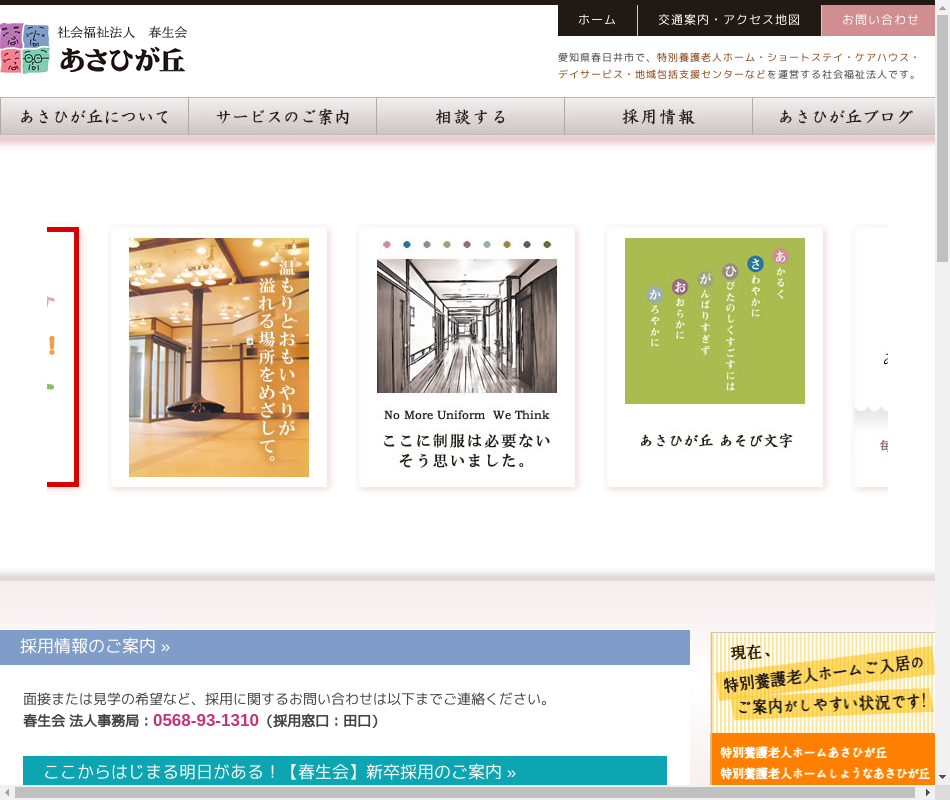 | 事業内容 | 特別養護老人ホーム・ショートステイ・デイサービス・生活支援ハウス・ケアハウス・居宅介護支援事業所・養護老人ホーム地域包括支援センター |