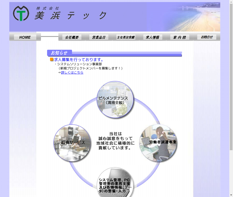 | 事業内容 | 総合清掃業務・設備管理業務・警備保障業務・環境衛生管理業務・電話交換・受付・学校等給食業務・建物営繕業務等建物総合管理 一般派遣業 派21-300143 |