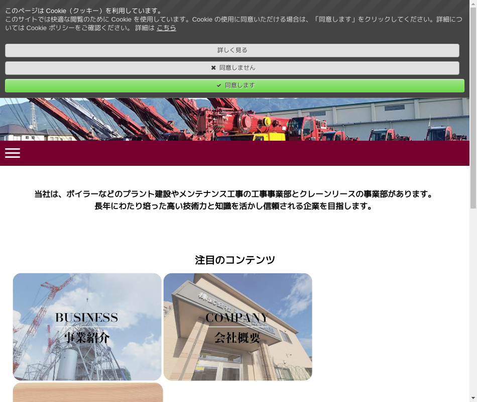 | 事業内容 | ボイラー本体据付・修繕・改修 配管製缶据付工事 各種プラント据付組立工事 重量物運搬・据付工事 足場組立工事 油圧式大型~小型クレーン作業 |