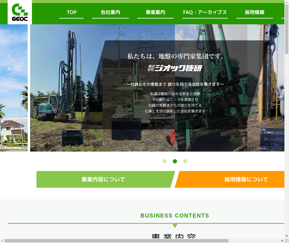事業内容 | 住宅関連事業(地盤調査・地盤改良工事)、土木関連事業(さく井工事他)、環境エネルギー事業(太陽光・地中熱工事他) |