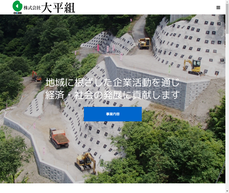 事業内容 | 土木工事業(主に道路工事、河川工事、消雪パイプ工事、圃場整備工事の施工を行っています)。 |