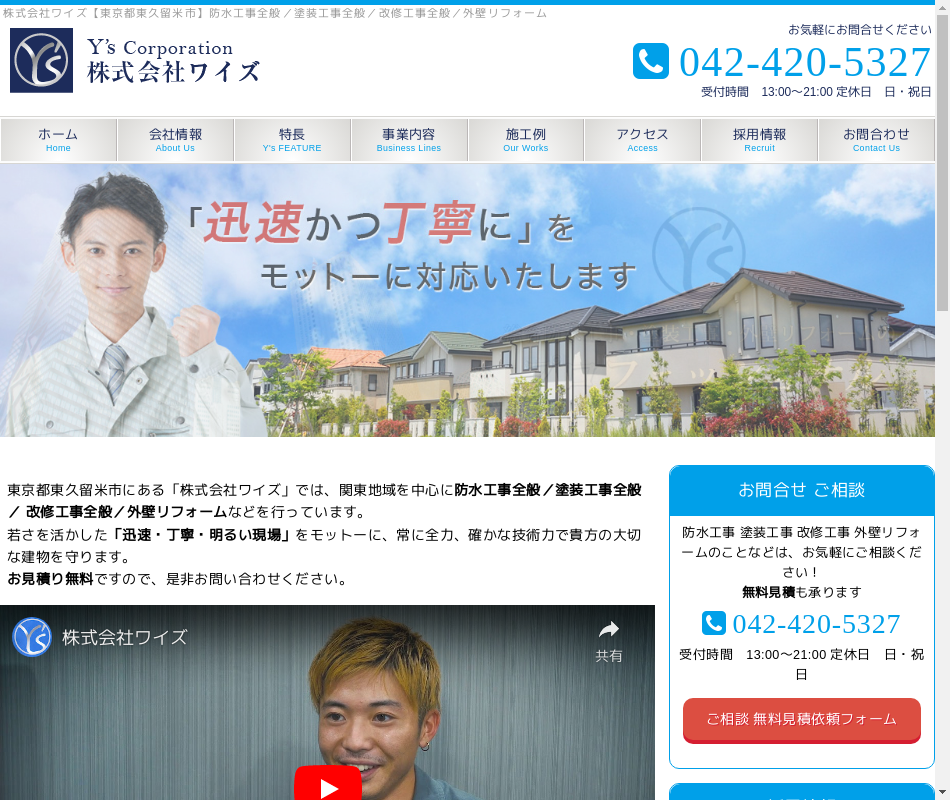 | 事業内容 | 当社は、東京都内を中心に関東一円の戸建て住宅の外壁塗装工事を行っております。建物を綺麗にするのはもちろんですが、紫外線から外壁を守っていくのも私たちの仕事です。 |