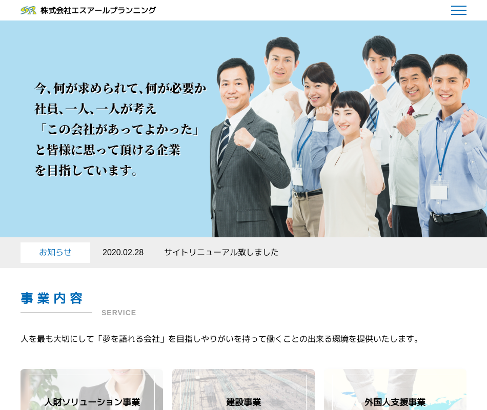 | 事業内容 | 建築工事業、労働者派遣事業、有料職業紹介事業、登録支援機関、経営コンサルタント事業。派13-303233、13-ユ-311429、19登-002705 |