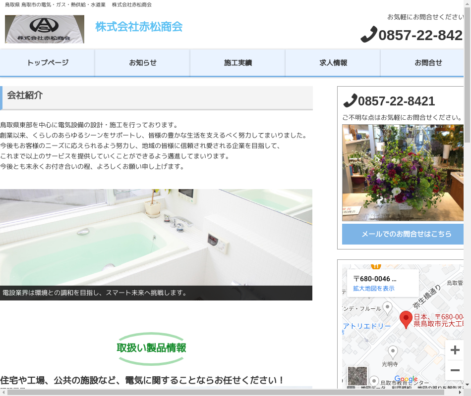 | 事業内容 | 鳥取県東部を中心に電気設備の設計・施工を行っています。公共・企業・病院・家庭と幅広く電気工事を行っています。 |