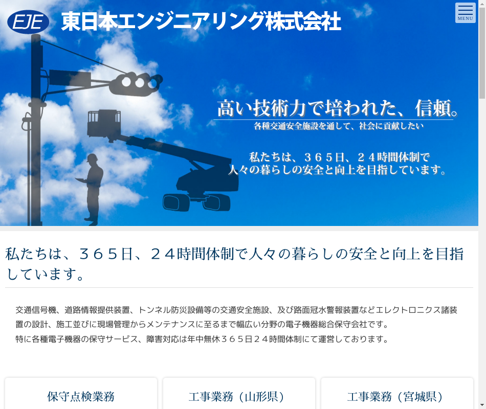 | 事業内容 | 電気工事業及び電気通信工事業、土木工事業。県下全域の交通安全施設(交通信号機、トンネル防災設備、道路情報板他各種電子機器の総合保守点検業務及び工事、並びに受変電設備工事一式。 |