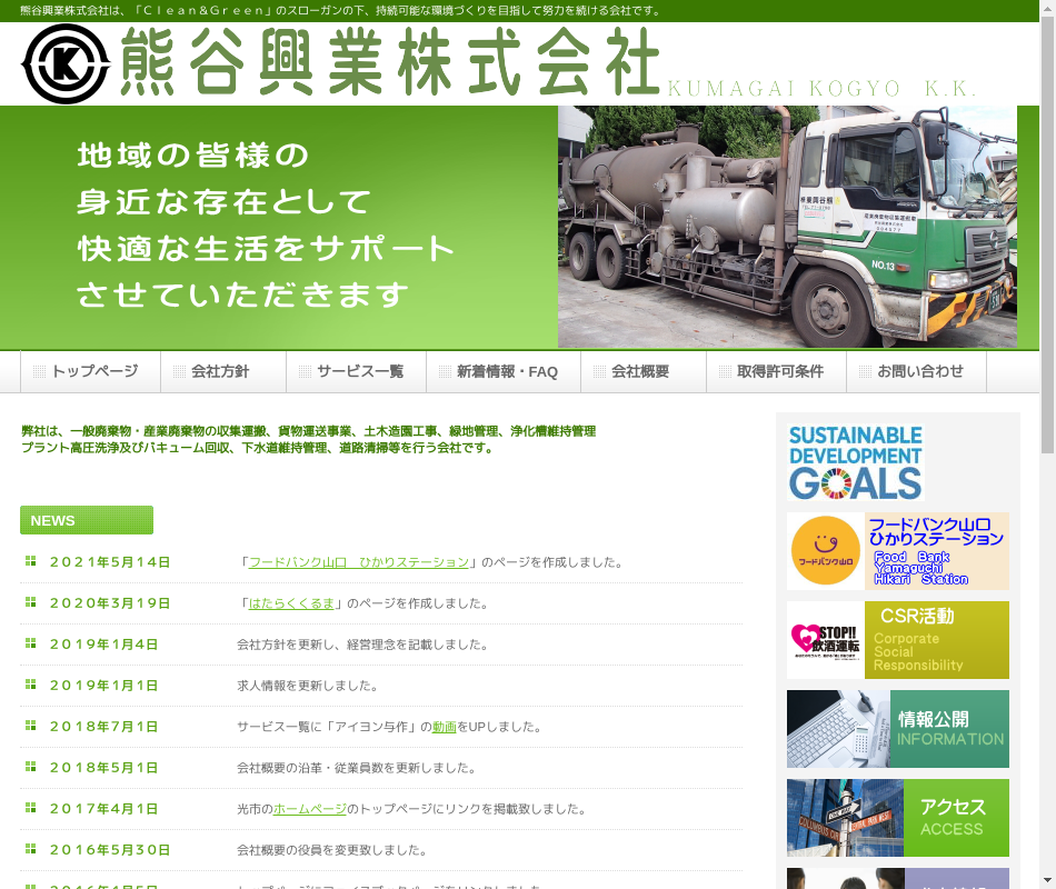 | 事業内容 | 昭和29年創業以来、地元地域の環境整備と緑化整備を二本の柱として、廃棄物の収集運搬事業、造園土木工事業、浄化槽清掃並びに維持管理事業、下水道維持管理事業を展開しています。 |
