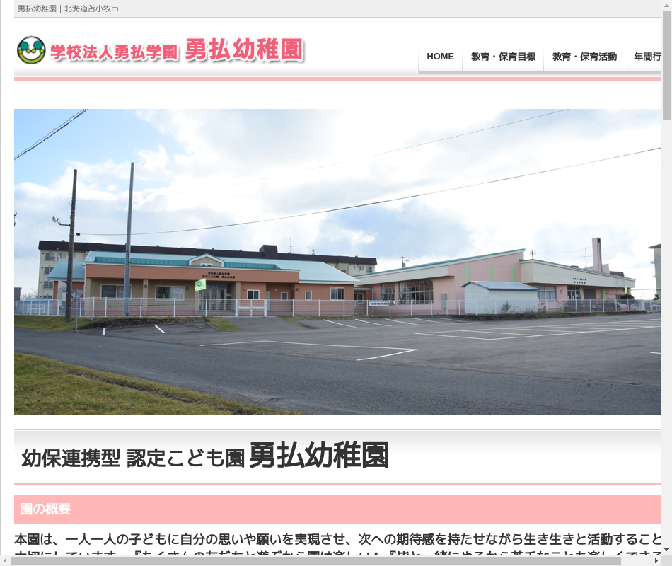 事業内容 | 幼児の成長発達の度合いを十分に考慮し、興味や関心に基づいた直接的で具体的な活動を通して人間形式の基本となる心情・意欲・態度など養われる時期に幼児教育の生活原理を徹底させる。 |