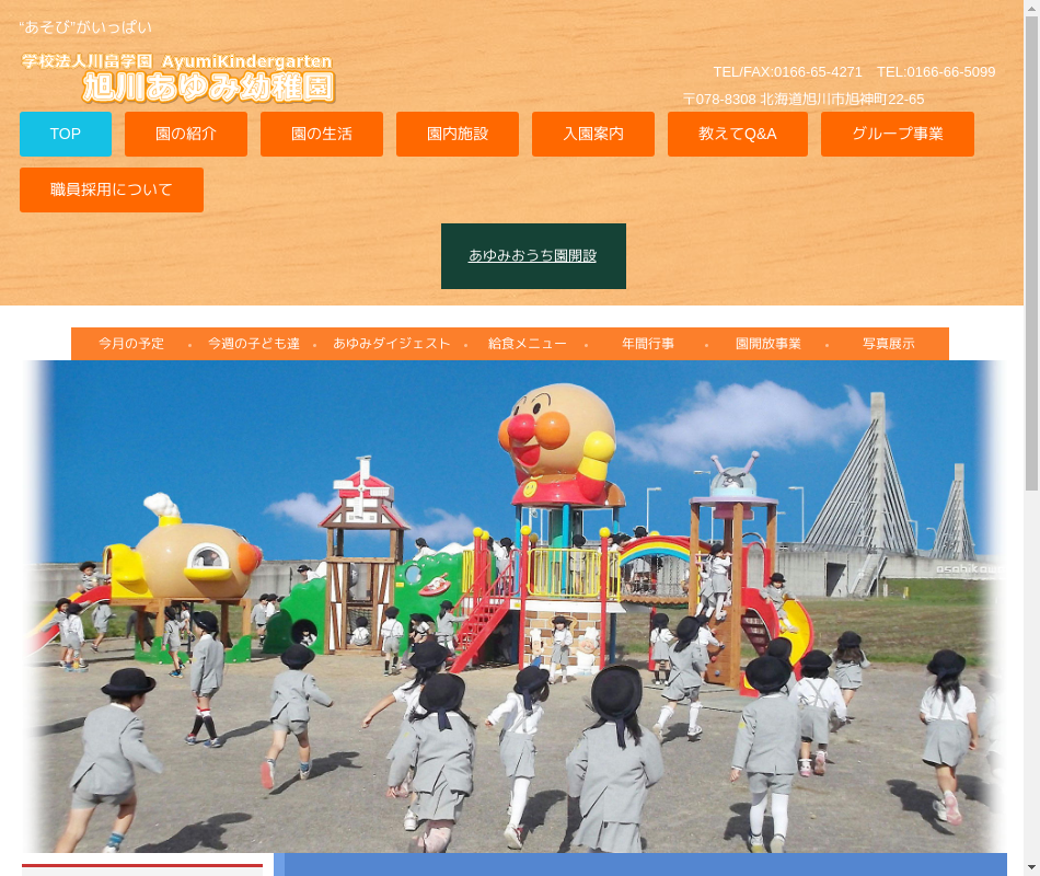 事業内容 | 旭川あゆみ幼稚園と併設の附属保育園、小規模保育室あゆみ、地域子育て支援センター、アフタースクールあゆみが連携して、乳幼児から小学生まで、地域の子どもたちの健全育成を支援しています。 |
