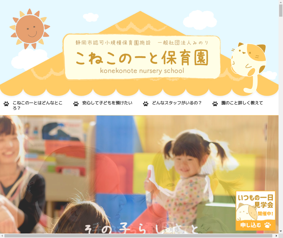 事業内容 | 0~2才の子どものための定員18名の静岡市認可小規模保育園です。平成27年4月に開園しました。保護者や地域の皆さんとともに一人一人を大事に安心安全で家庭的な子育てを実践してます。 |