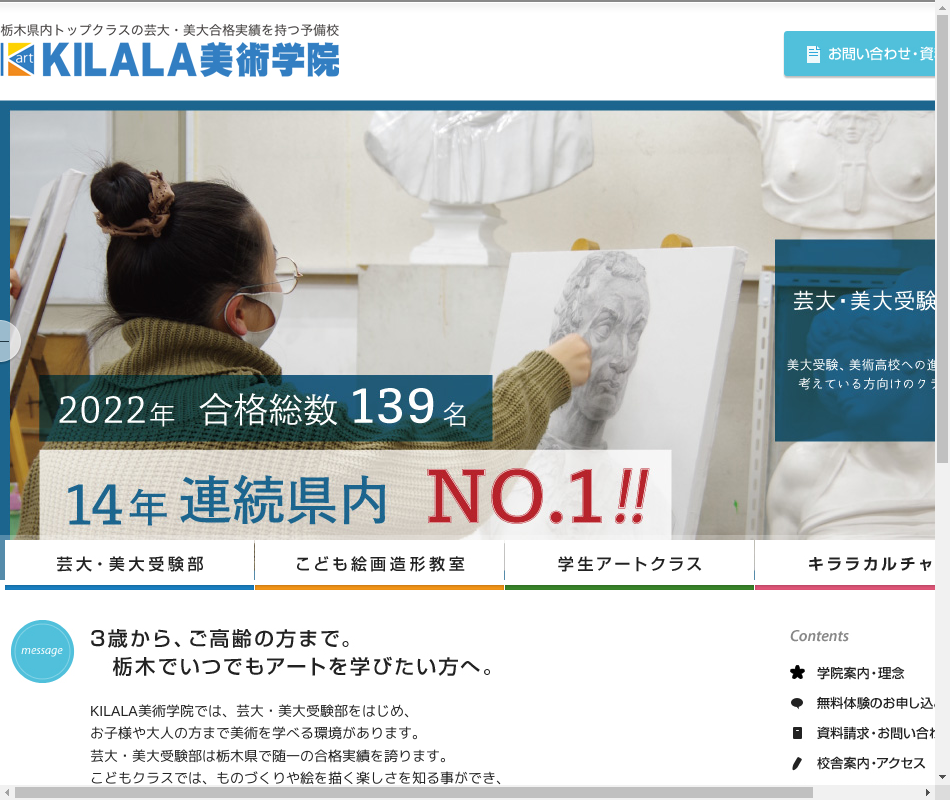 | 事業内容 | 3才から12才までの絵画造形教室。10才から18才までの油画、彫刻、デザインの学生科。美術系高校、大学の受験科(油画・日本画、デザイン、彫刻、建築)、基礎科を指導する美術学院 |