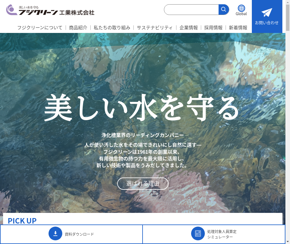 | 事業内容 | 【美しい水を守る】という理念のもと、水処理プラント・FRP製浄化槽・ブロワー等の開発から設計・製造販売・施工までを行っています。 |
