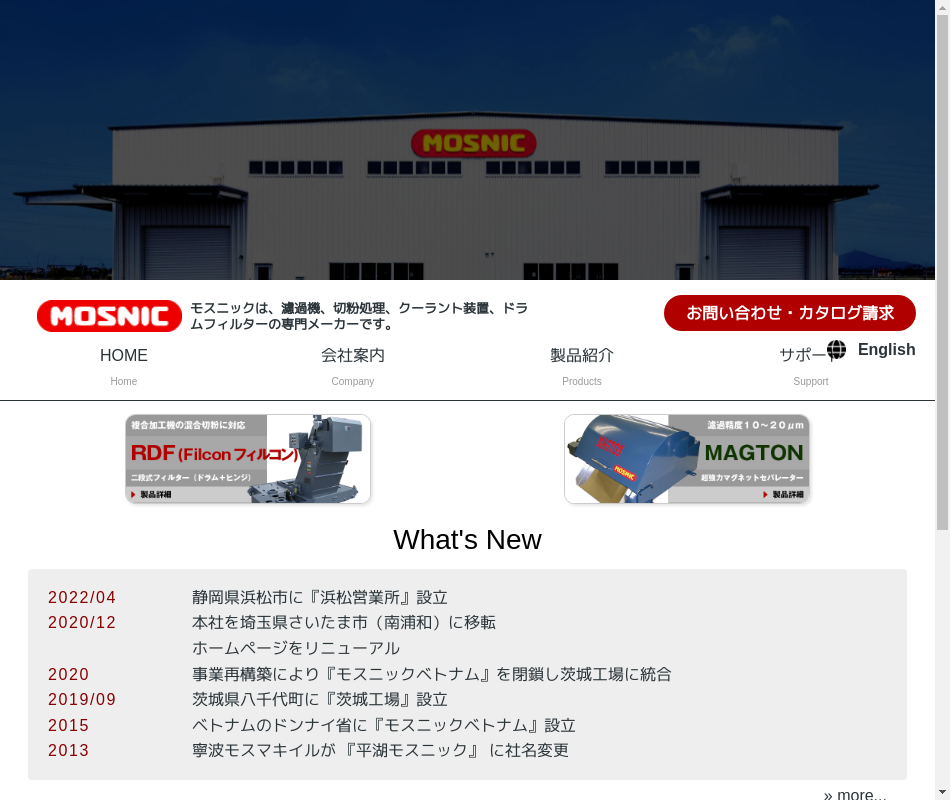 | 事業内容 | 機械加工・圧延工程・金属表面処理設備等のクーラント液濾過装置の設計・製造・販売。 |