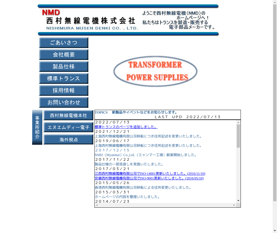 | 事業内容 | 電子部品製造販売関連会社:NMD電子(株)香港西村無線(有)、上海西村無線(有)他中国2工場、ミャンマー工場 |