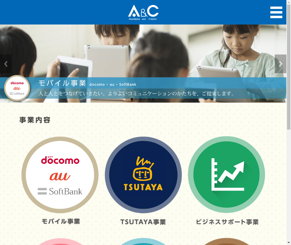 モバイル事業(ドコモ・au・ソフトバンク) ツタヤ事業 ビジネスサービス事業 保険事業 その他事業(コインランドリー・カフェ)