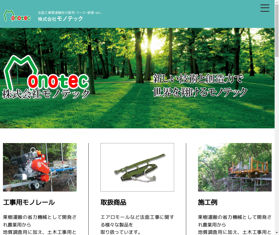 | 事業内容 | 工事用モノレールの販売設計施工。リース修理。 法面(のりめん)工事 |