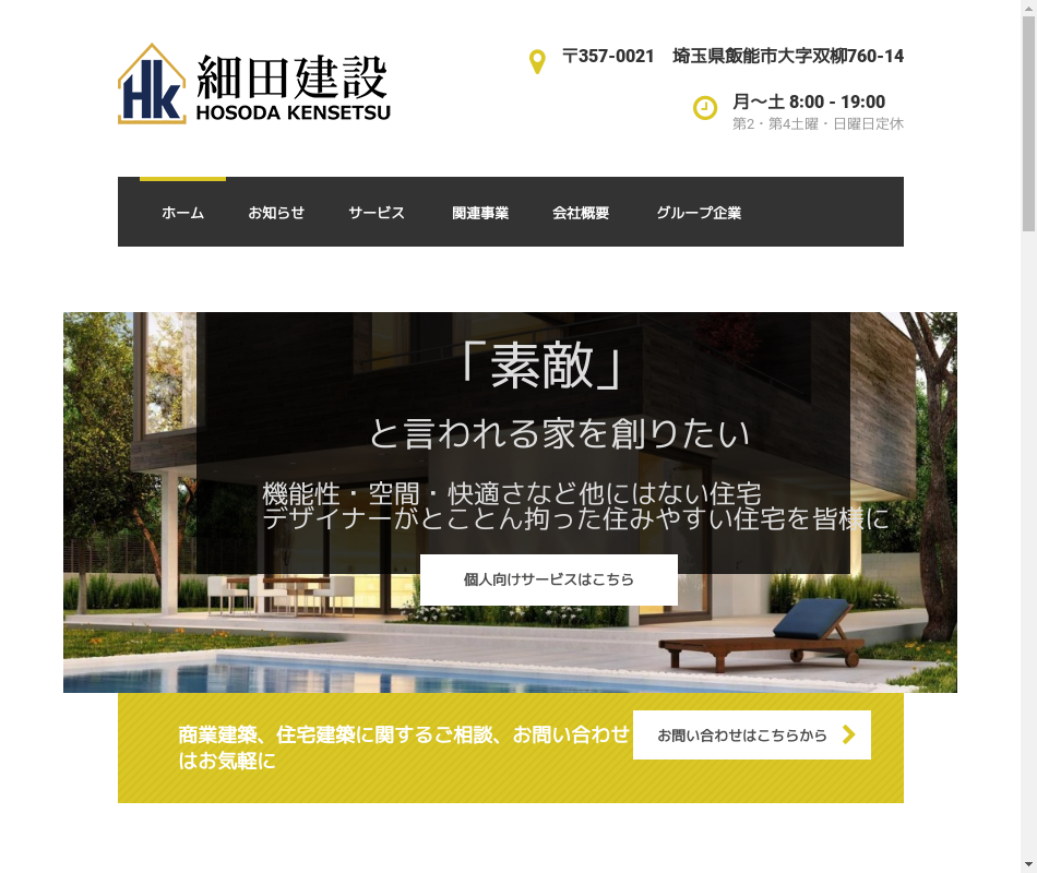 | 事業内容 | 注文往宅から、商業ビル、マンションまでの建築全般・付帯業務として土木工事、舗装工事、造園工事など行っています。関連会社に飯能資材株式会社があります。 |