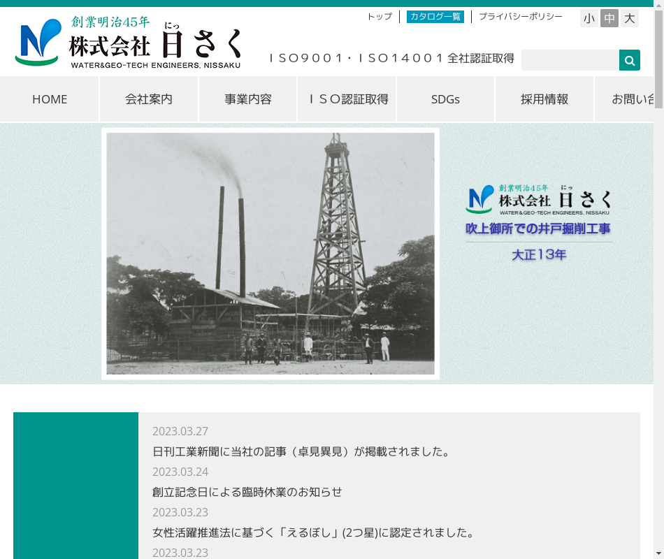 | 事業内容 | 1、さく井(井戸掘削)工事 2、井戸改修工事 3、設備工事 4、地質調査・建設コンサルタント 5、特殊土木工事 6、海外事業(ODA地下水プロジェクト) 7、井戸用設備製造・販売 |