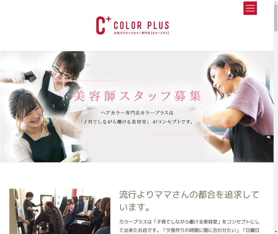 | 事業内容 | ヘアカラー専門美容室(カラープラス)の運営今後も多数出店予定の勢いのある会社です!2022年は7月時点で3店舗オープンしました! |