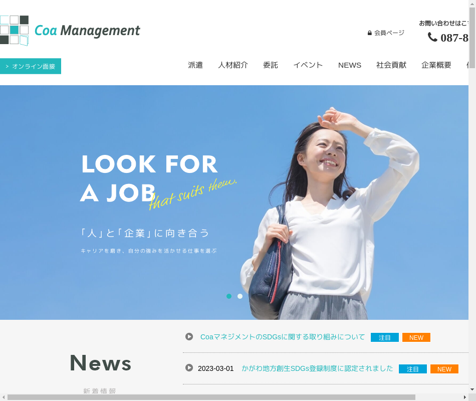 | 事業内容 | 労働者派遣事業、有料職業紹介事業、請負事業、委託事業、人財育成業 一般労働者派遣許可番号 派37-3000090 職業紹介許可番号 37-ユ-300097 |
