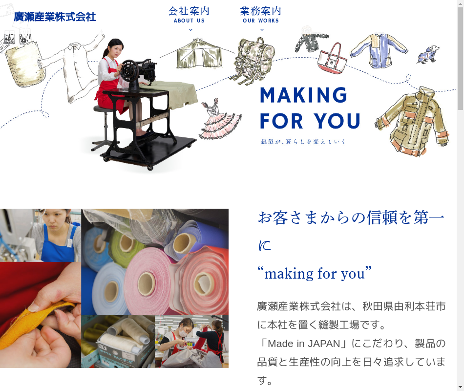 | 事業内容 | 地方自治体消防用防火衣、防衛庁背のう等官庁用厚物の縫製、ゴルフレインウェア、テント、ザック等アウトドア用品の縫製加工◆秋田県就活情報サイト【こっちゃけ】掲載中!◆ |