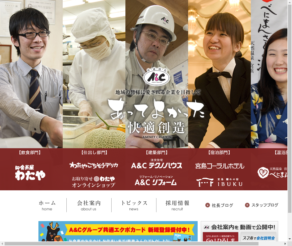 事業内容 | 飲食部門・仕出し部門・ホテル部門(宮島コーラルホテル宿泊、飲料・宮島離れの宿IBUKU)・建築部門(新築・リフォーム)温浴部門(べにまんさくの湯)5部門で形成運営しております。 |