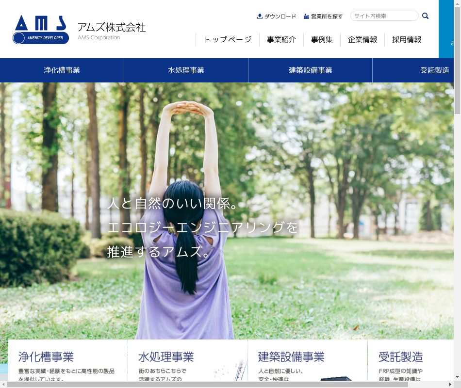○水処理事業 各種汚水処理施設の設計・施工 ○浄化槽事業 工場生産浄化槽・廃水処理槽の研究開発・設計・製造・販売 ○建築設備事業 空調・給排水・衛生設備や防災設備の設計・施工・管理
