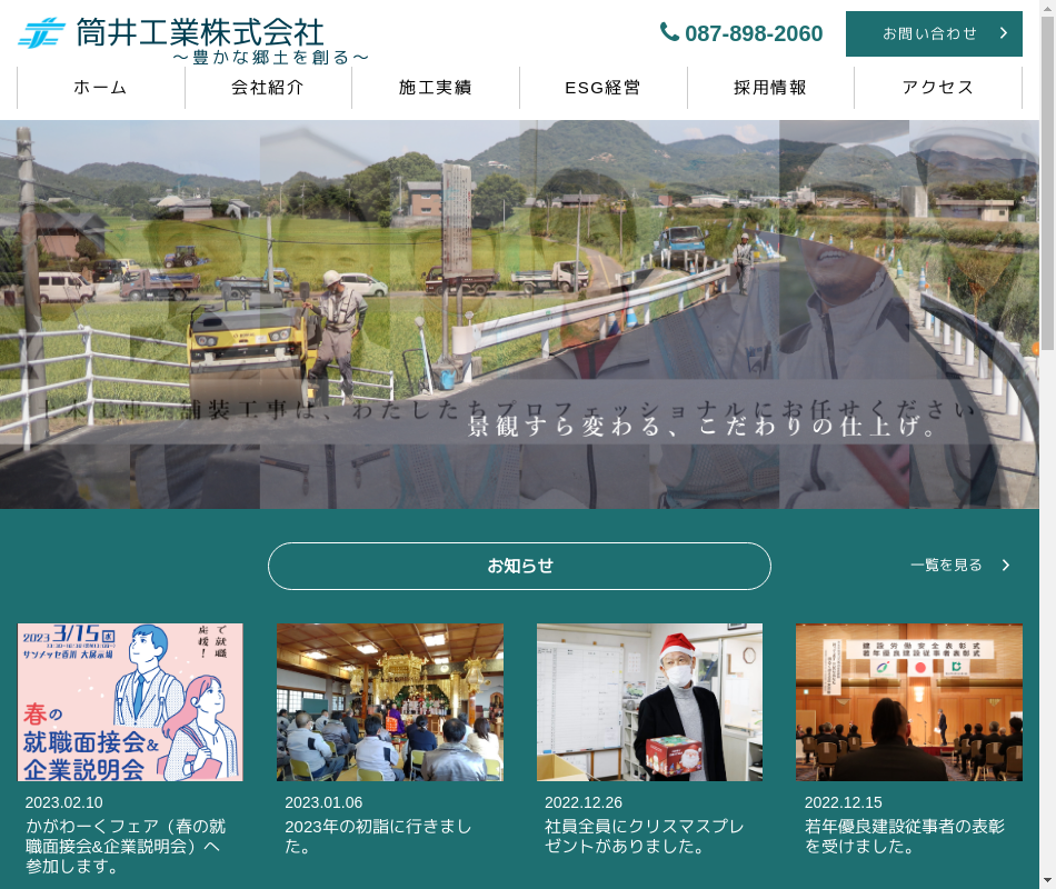 | 事業内容 | 土木一式工事のほか、舗装工事など各種専門工事を取り扱います。官公庁や民間の元請主体に、香川県内各所で施工しています。現場は県内に限りますので基本的には日帰りです。 |