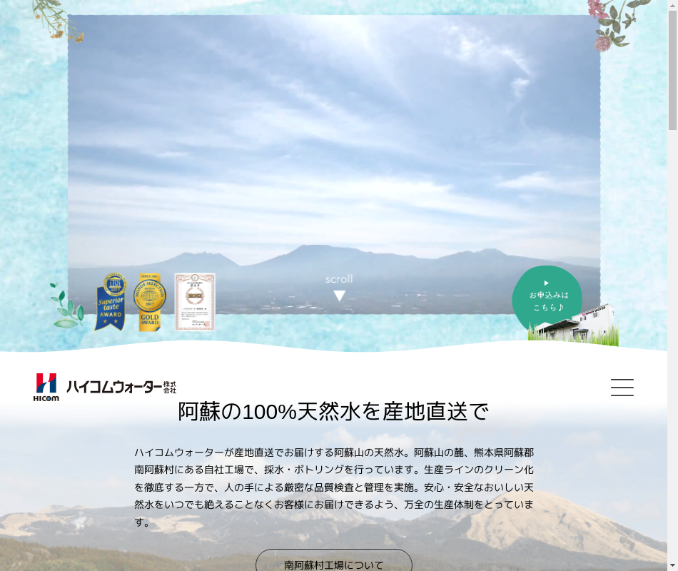 | 事業内容 | 阿蘇外輪山で育まれ、南阿蘇村で採水した100%天然水(ナチュラルミネラルウォーター)をボトリングし、宅配水サーバーのボトルとして発送します。 |