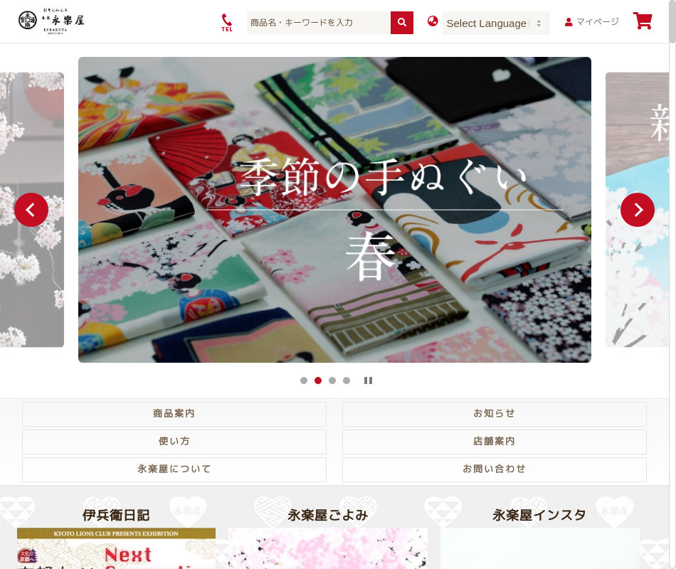 2000年に十四世現当主が町家手拭を中心とする直営店舗「永楽