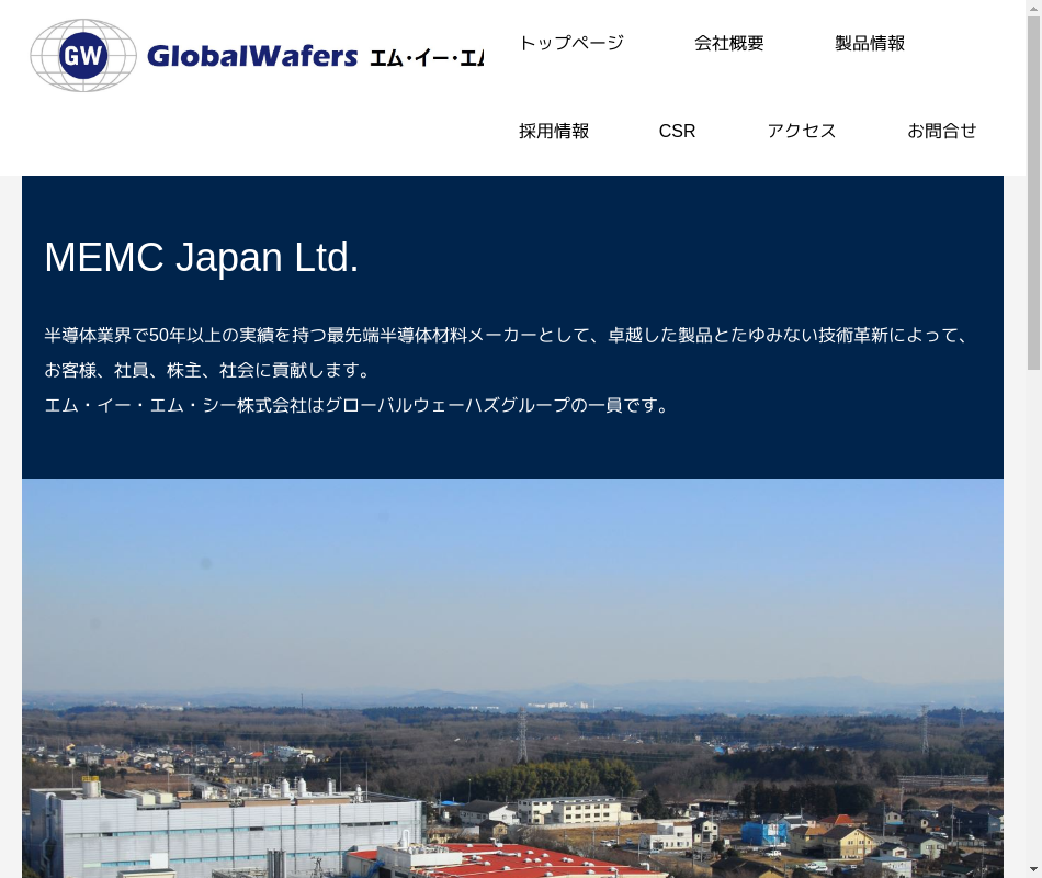 | 事業内容 | 半導体材料(シリコンウェーハ)の製造・販売世界9ヵ国に17拠点をもつ世界3位のシリコンウェーハメーカーであるグローバルウェハーズの日本の拠点の一つです。 |