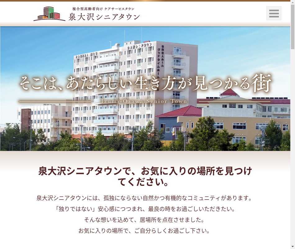 | 事業内容 | 複合型高齢者向けケアサービスタウンとして、包括的に次のサービスを運営しております。高齢者福祉事業(特別養護老人ホーム、住宅型有料老人ホーム、デイサービス、居宅介護支援事業) |