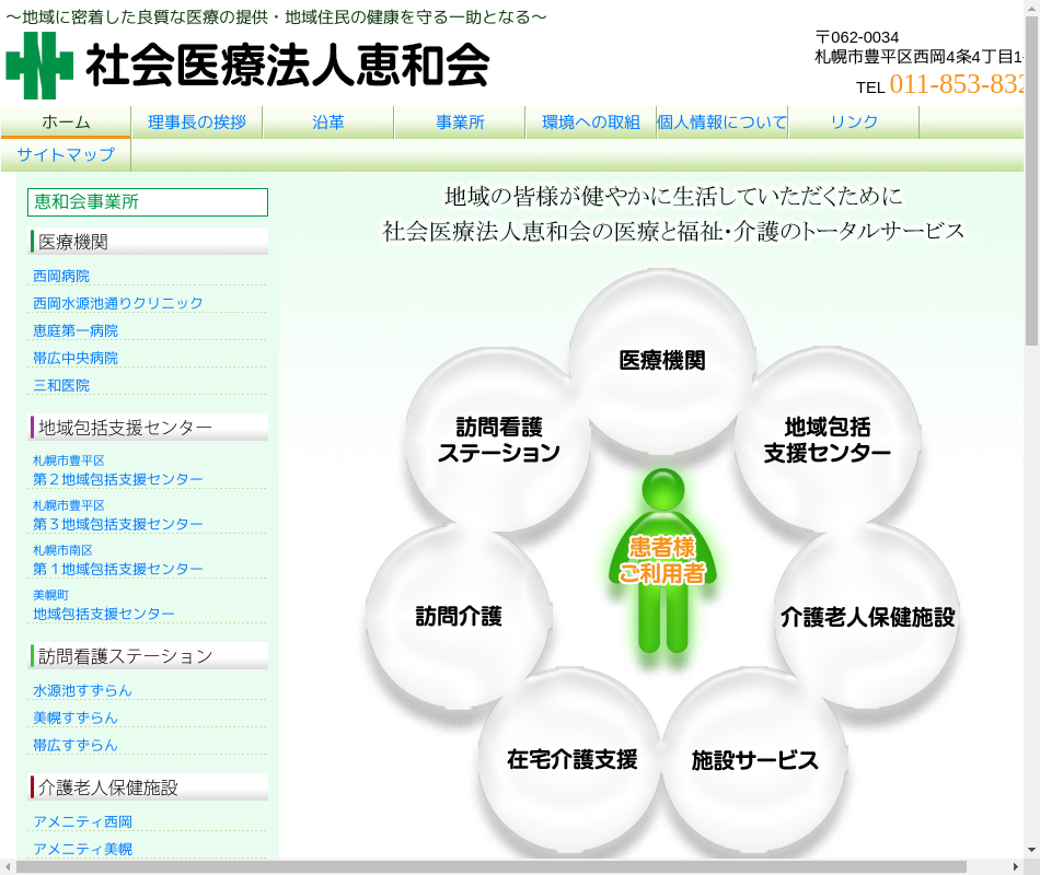 | 事業内容 | 医療と介護の両面から地域住民の健康を守り続けています。また、恵庭市、帯広町、美幌町、様似町にも医療・介護の機能を設置し総合的にサポートしています。 |