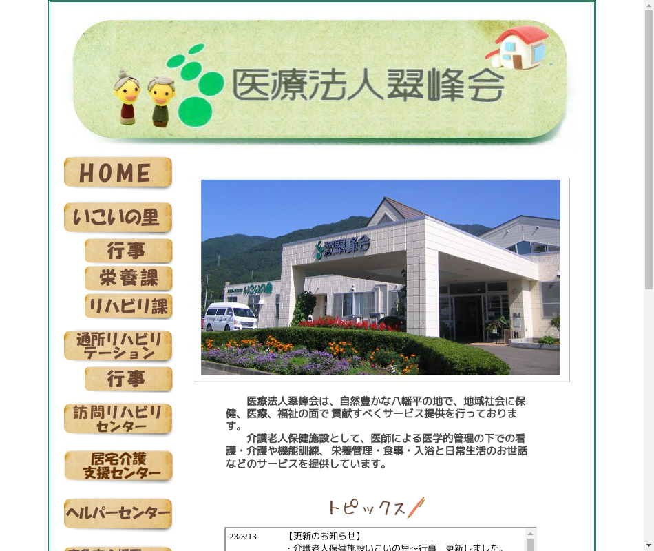 | 事業内容 | 介護老人保健施設いこいの里(入所定員100名、通所リハビリテーション60名/日)訪問リハビリテーション事業所、訪問介護事業所、居宅介護支援事業所、鹿角市八幡平地域包括支援センター |