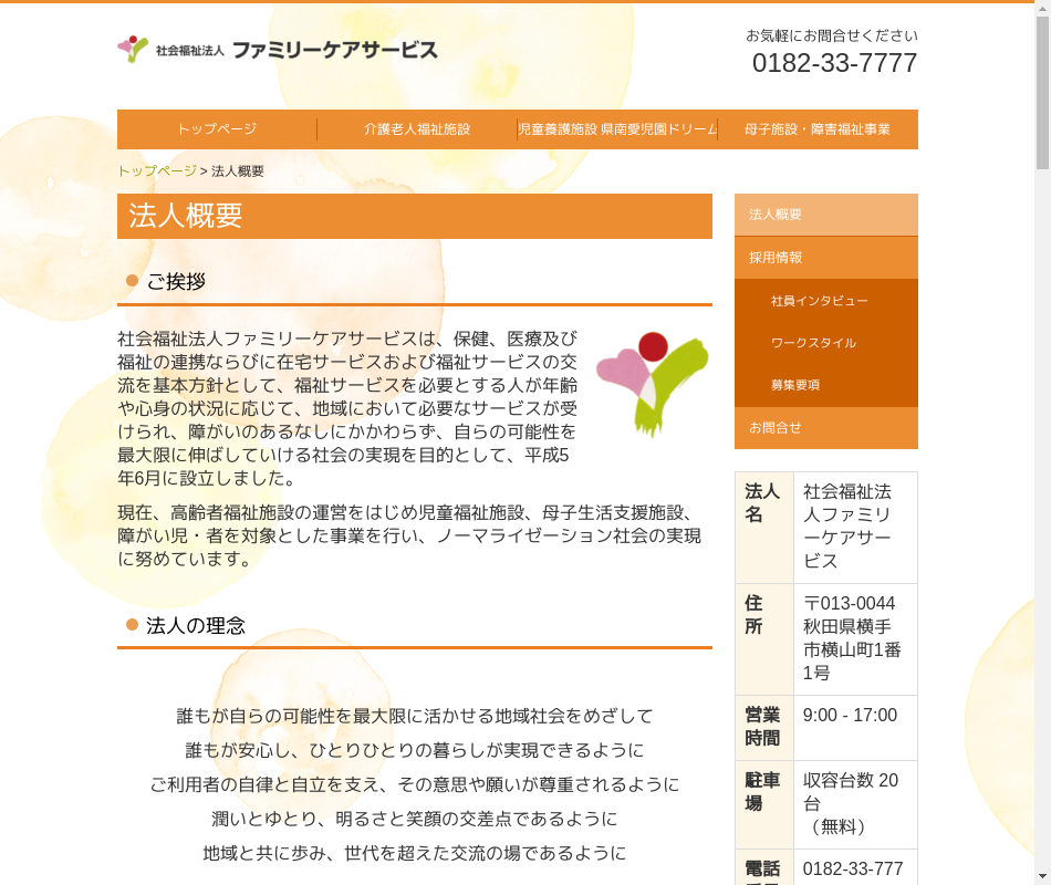 | 事業内容 | 特別養護老人ホーム(2ヶ所)、ショートステイ(2ヶ所)、小規模多機能型施設、能代市北地域包括支援センターも運営しております。 |