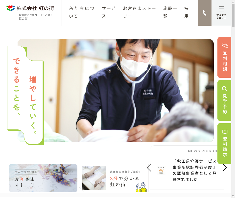 | 事業内容 | 在宅生活の可能性を高める「あきらめない介護」をビジョンにお客様の問題解決を、介護のプロとして提供しています。虹の街では県内36事業所/12種類の介護サービスを展開中 |