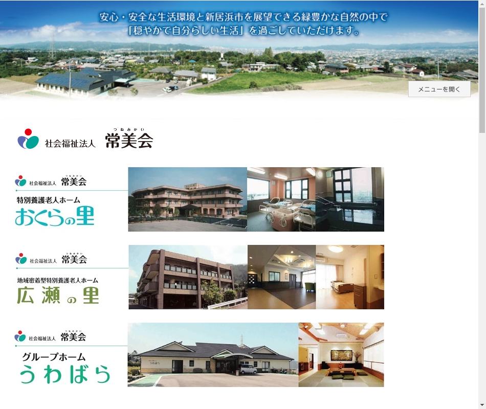 | 事業内容 | 新居浜市内にて、軽費老人ホームA型・小規模多機能型施設・グループホーム・小規模特別養護老人ホーム・認知症対応型デイサービス・地域包括支援センター協力機関・居宅介護支援事業所を運営。 |