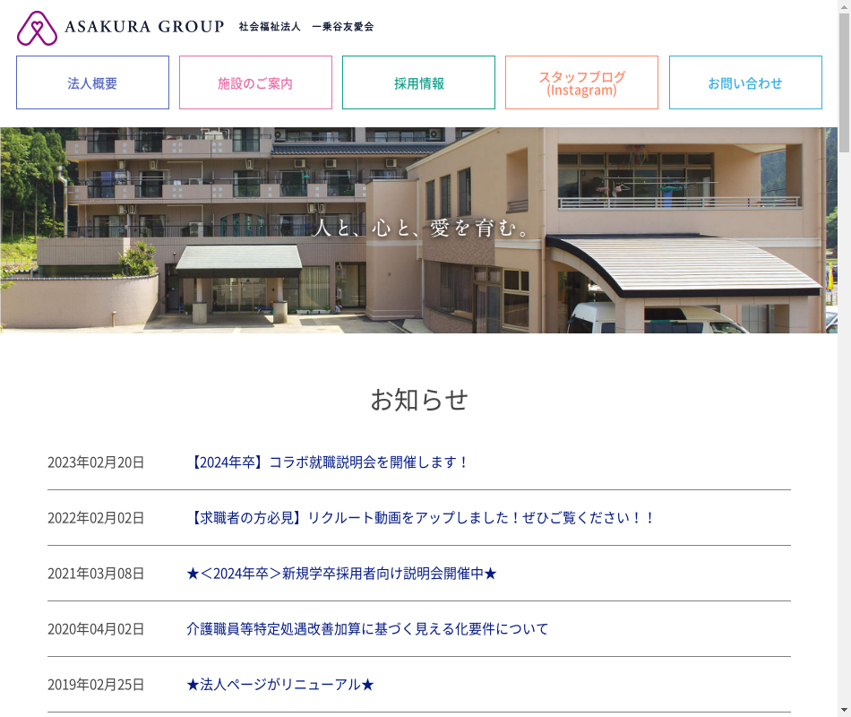 | 事業内容 | 介護老人福祉施設・短期入所・通所介護・居宅介護支援・こども園・サービス付き高齢者向け住宅等の事業を行っています。 |