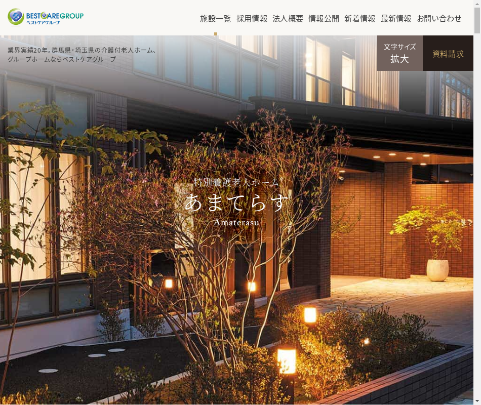 事業内容 | 高齢者介護事業運営を手掛け、ベストケアグループ全体で群馬県・埼玉県に9事業所を展開しております。 |