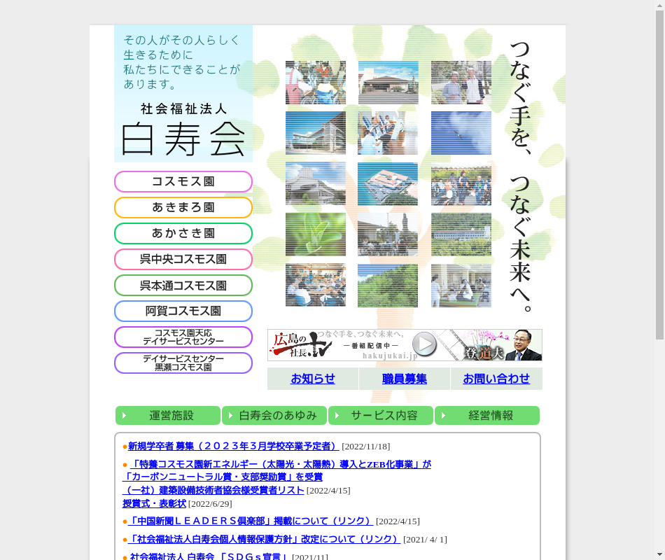 呉市及び東広島市で、特養4施設及び老健4施設、単独通所サービス2施設を運営しています。また、呉市より「包括支援センター」の委託を受けております。 「その人が その人らしく 生きるために 私たちに できることがあります」を法人の経営理念に、法令を遵守し、事業の健全運営によって、地域社会に貢献します。