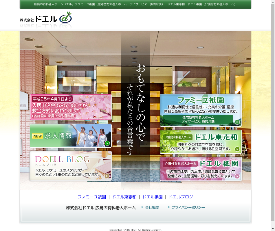 事業内容 | 介護付有料老人ホーム(介護保険適用)ドエル東志和定員49名 ドエル祇園定員50住宅型有料老人ホーム(ファミーユ祇園)定員45名 仕事内容の静止画有。相談窓口でご覧になれます |