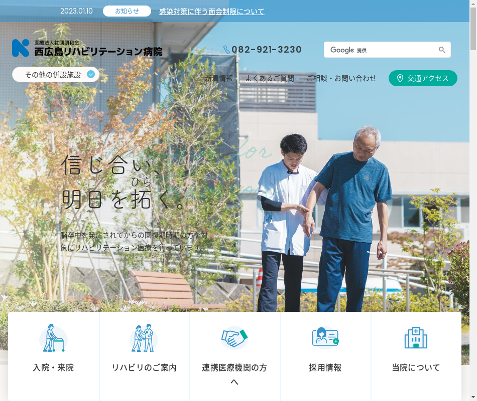 事業内容 | 西広島リハビリテーション病院:139床(内科、整形外科、脳神経外科、リハビリテーション科) 介護老人保健施設花の丘:入所96床、通所50人 健康開発センターウィル:人間ドック、ジム |
