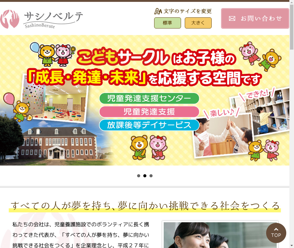 事業内容 | 障害福祉サービスを提供する会社です。主に放課後等デイサービスを通じて対象となる児童の成長に関わっていきます。型にはまらず、個々に向き合った療育を行い、児童の個性を磨く事が目標です。 |