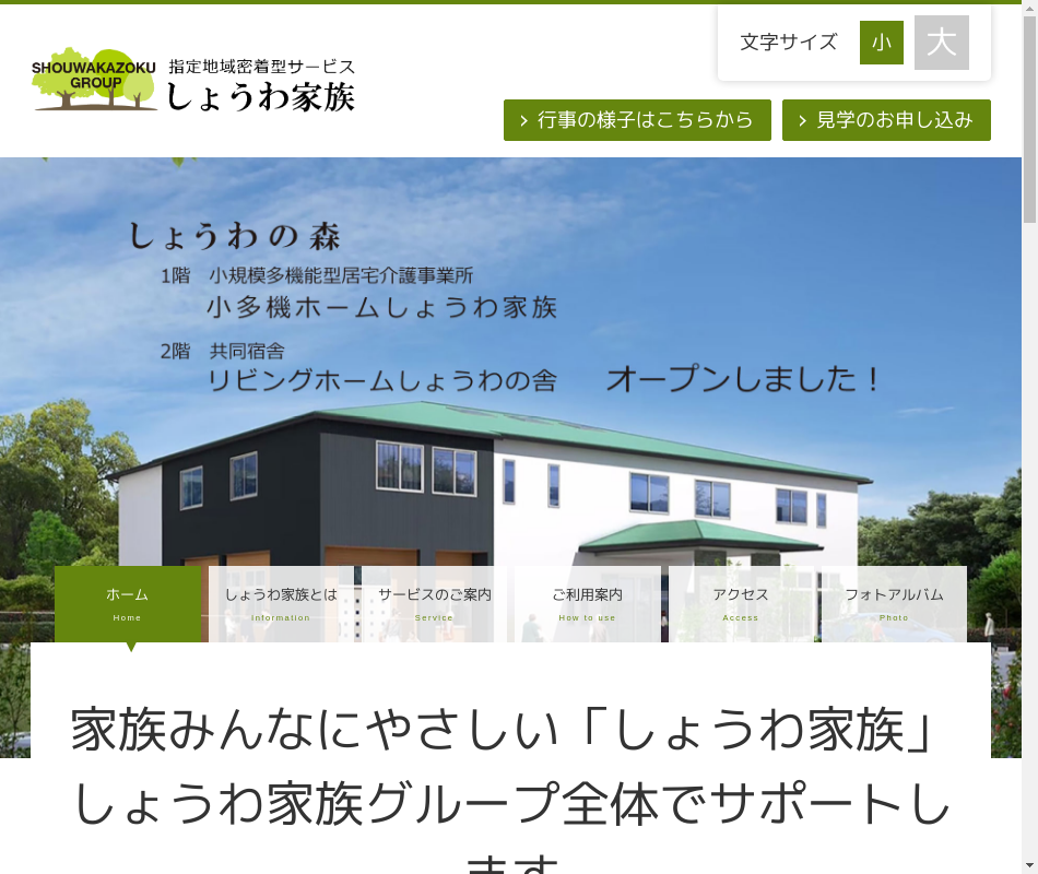 | 事業内容 | 認知症対応型共同生活介護(グループホームしょうわ家族、デイホームしょうわ家族)認知症対応型通所介護(デイサービスしょうわ家族)居宅介護支援事業(ケアプランセンターしょうわ家族) |