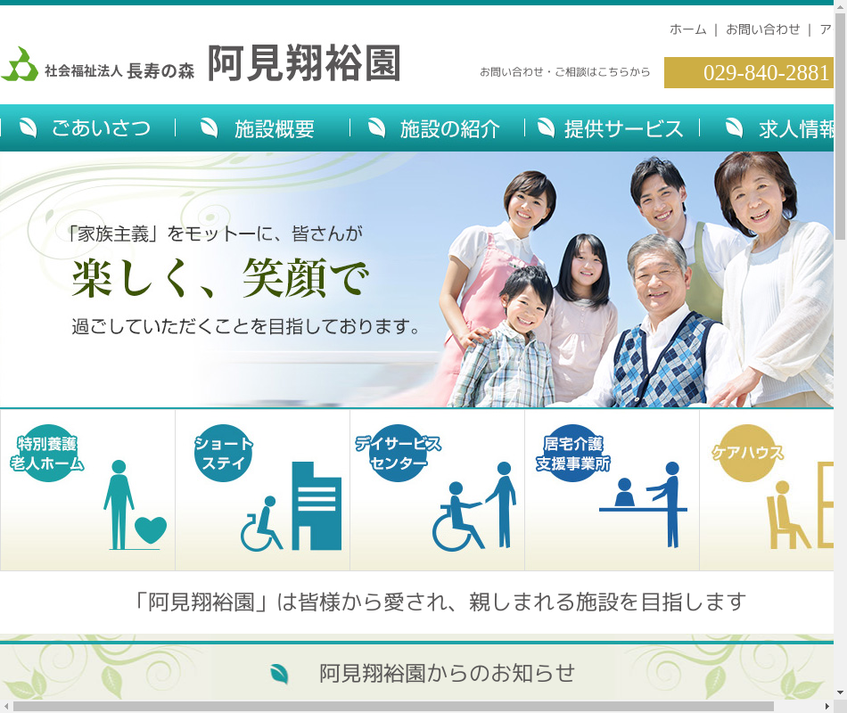 | 事業内容 | 茨城県阿見町で特別養護老人ホーム(従来型)・ショートステイ・デイサービス・居宅介護支援事業所・ケアハウスを運営する社会福祉法人です。 |