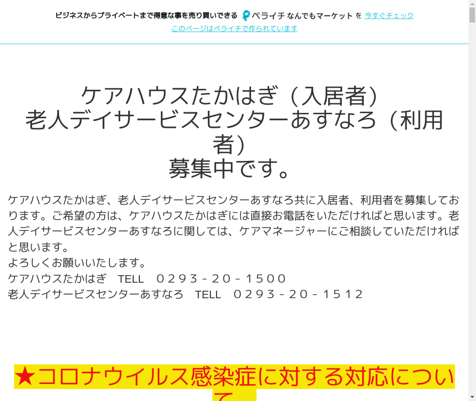 | 事業内容 | 社会福祉施設の1つである軽費老人ホーム「ケアハウスたかはぎ」と併設施設として「老人デイサービスセンターあすなろ」があります。 |