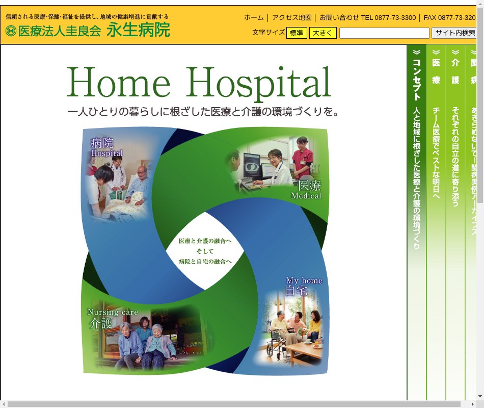 永生病院:一般病床40床・介護医療院90床、透析21床 診療科目(内科、呼吸器内科、循環器内科、 消化器内科他11診療科) 通所介護:いこいの家、げんきの郷 居宅介護支援事業所:いこいの郷 グループホームこんぴら 小規模多機能型居宅介護:サンライズこんぴら
