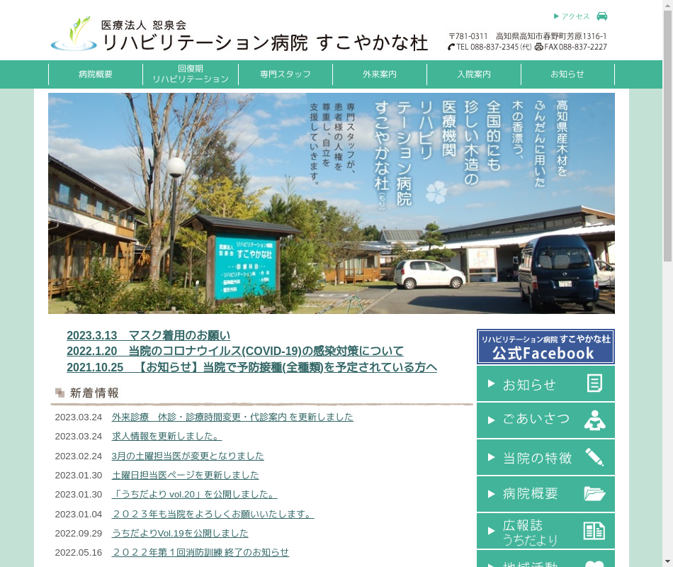 ●内田脳神経外科(救急・労災指定診療所) 「医療で一番大切な他人への思いやりを大事にしたい」という想いで、全ての患者様に対して最適な医療提供を実践いたします。 ●介護老人保健施設ピアハウス高知 『ピア』には『かけ橋』という意味があり、心と心の架け橋、家族と利用者様の架け橋、病院と在宅の架け橋となるべく、ピアハウス高知と命名しました。 ●リハビリテーション病院 すこやかな杜 林野庁長官賞を受賞した全館木造建築の病院です。「人は自然に近いほど健康に生きられる」という信念のもと、患者様に安心と快適さを提供いたします。