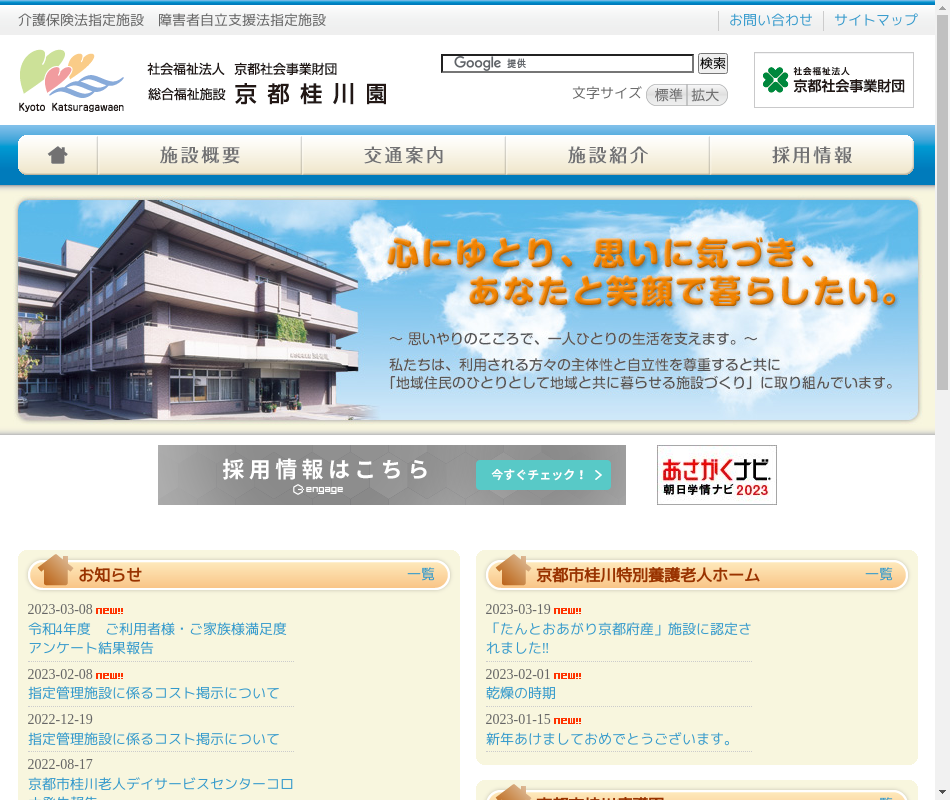 | 事業内容 | 介護老人福祉施設と障害者支援施設が合築された京都市内唯一の総合福祉施設です。他に老人デイサービス、障害者デイサービス、居宅介護支援事業所、地域包括支援センター等を展開しています。 |