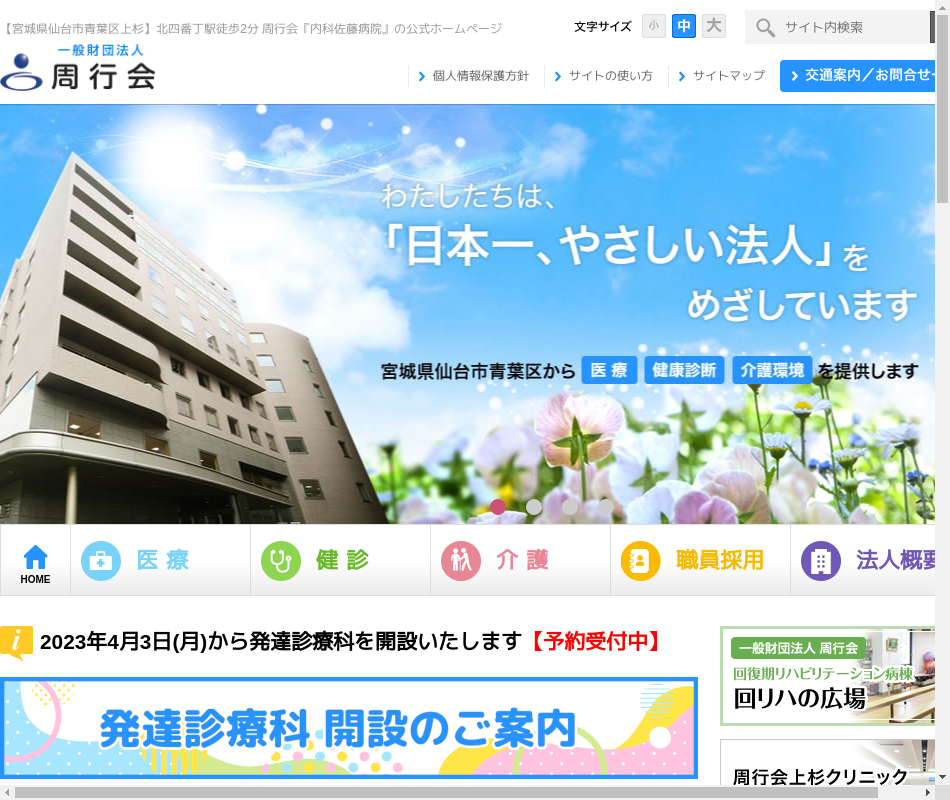| 事業内容 | 内科佐藤病院、老健トラスト、あすと長町みんなのクリニック上杉クリニック(健診センター)、北四番丁よいこの保育園訪問診療、地域包括、在宅介護、訪問看護、ヘルパーステーション |