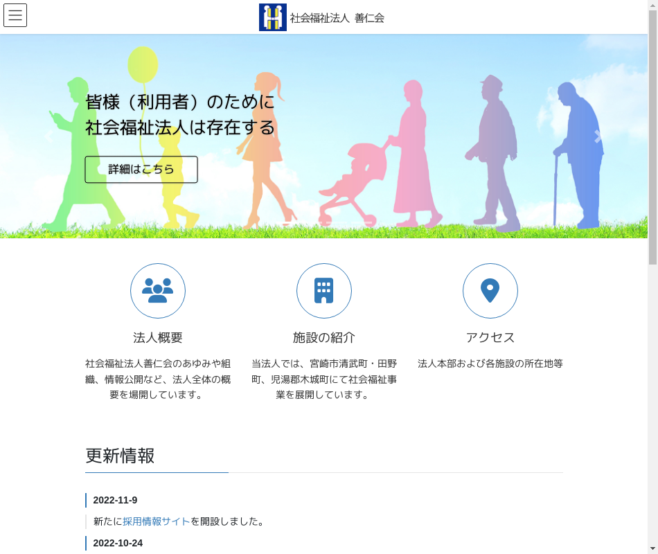 | 事業内容 | 老人福祉事業(・特別養護老人ホーム・ショートステイ・デイサービス・グループホーム・生活支援ハウス・在宅介護支援センター・地域包括支援センター) |